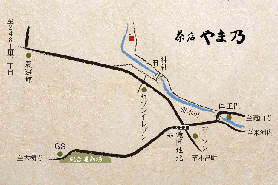 茶店「やま乃」は岡崎市の北部、滝山寺仁王門にほど近い山辺の川沿いにあります。